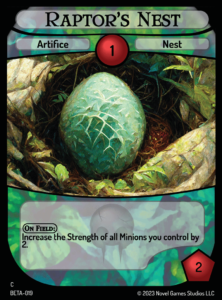 Over the next few turns, you’ll be collecting more cards to hold steady and eventually unleash your blowout turn. During this time, your Minions can be on the offensive—with high Strength thanks to a Raptor’s Nest or two, and high Health thanks to Grizzly Platypus Den, your Minions can march through your opponent’s front line, and inevitably, destroy their Artifices!