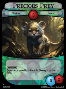 Precious Prey is a great card, but it needs help to draw you cards when it eventually resolves. That’s where Raptor’s Nest comes in—you’ll even draw a second one before the Minion comes into play, letting it draw you potentially up to 4 cards on its own if all goes according to plan. Play both of these cards, as well as the Protecting Guidestone. Do not play Rip to Shreds! You’ll save this up to use along with some other cards to pump up Blazing Raptor all in one turn.