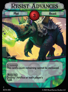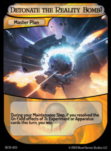 Detonate the Reality Bomb! is a Master Plan which reads “During your Maintenance Step, if you resolved the On Field effects of 7+ Experiment or Apparatus cards this turn, you win.” It is most closely associated with Experiment and Apparatus cards, and focuses building an engine of conditional effects all working in tandem to perform an arbitrary but game-winning combo.