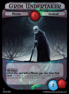You can either sacrifice Grim Undertaker to play Expensive Knowledge right away, or hold onto Expensive Knowledge and use Grim Undertaker to attack an opponent’s vulnerable Minion or Artifice. You may also need to consider whether your opponent may be able to thwart your Greedy Page-Turning before your next turn, in which case playing the Expensive Knowledge is critical, as you will absolutely need to draw at least two extra cards next turn, if not more.