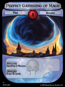Cast the Doomspell! is a Master Plan which reads “If you resolve an Arcana Plot with Starting Countdown 8+, you win.” It is most closely associated with Arcana and Grimoire cards, and focuses on resolving either Archmage’s Doomspell or Perfect Gathering of Magic, the only two cards in the set that can fulfill the Master Plan’s win condition.